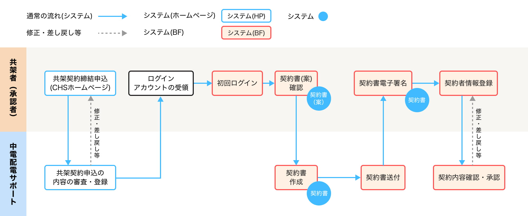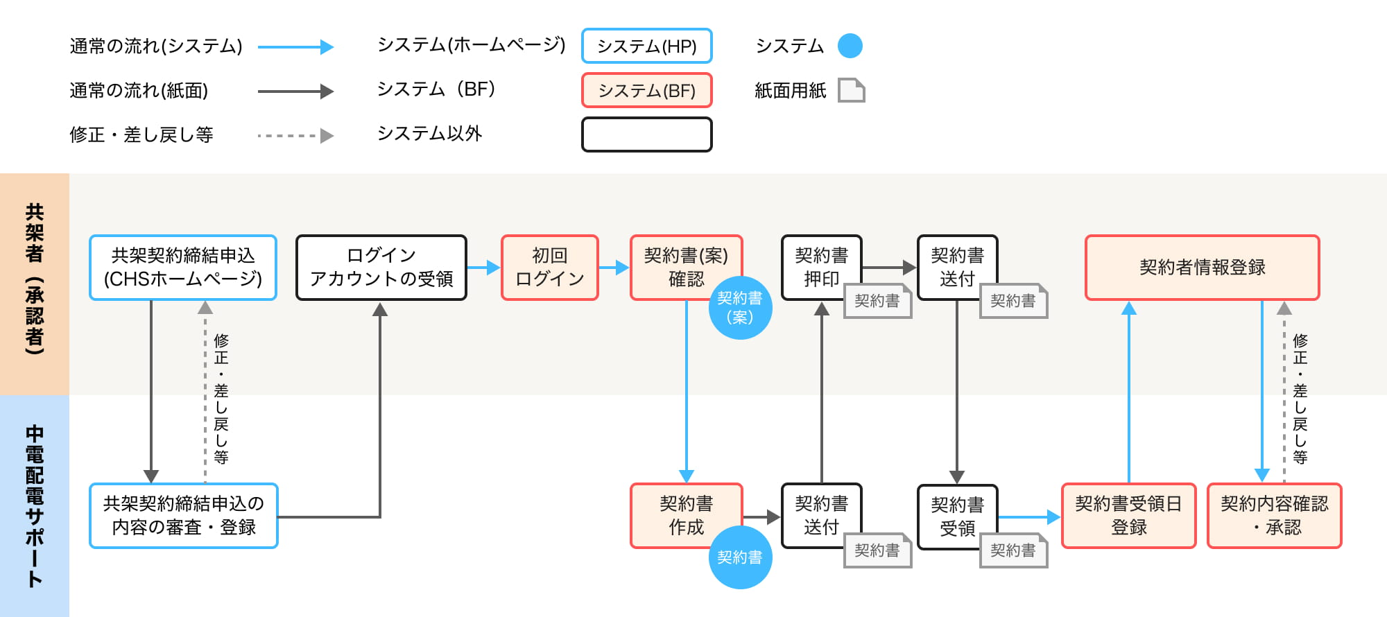 下記の「お申込み前の確認事項」からご確認をいただくようにお願いいたします。内容に同意いただける場合は、「共架契約締結の申込み入力フォーマット」より共架契約の締結申込をお願いします。